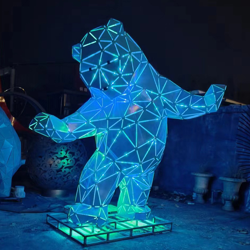 "Stainless Steel Geometric Bear" sculpture adopts a faceted, angular design style with an irregular combination of planes. Lights can be placed inside the bear's body, which can glow at night to present a three-dimensional and simple and modern visual effect.